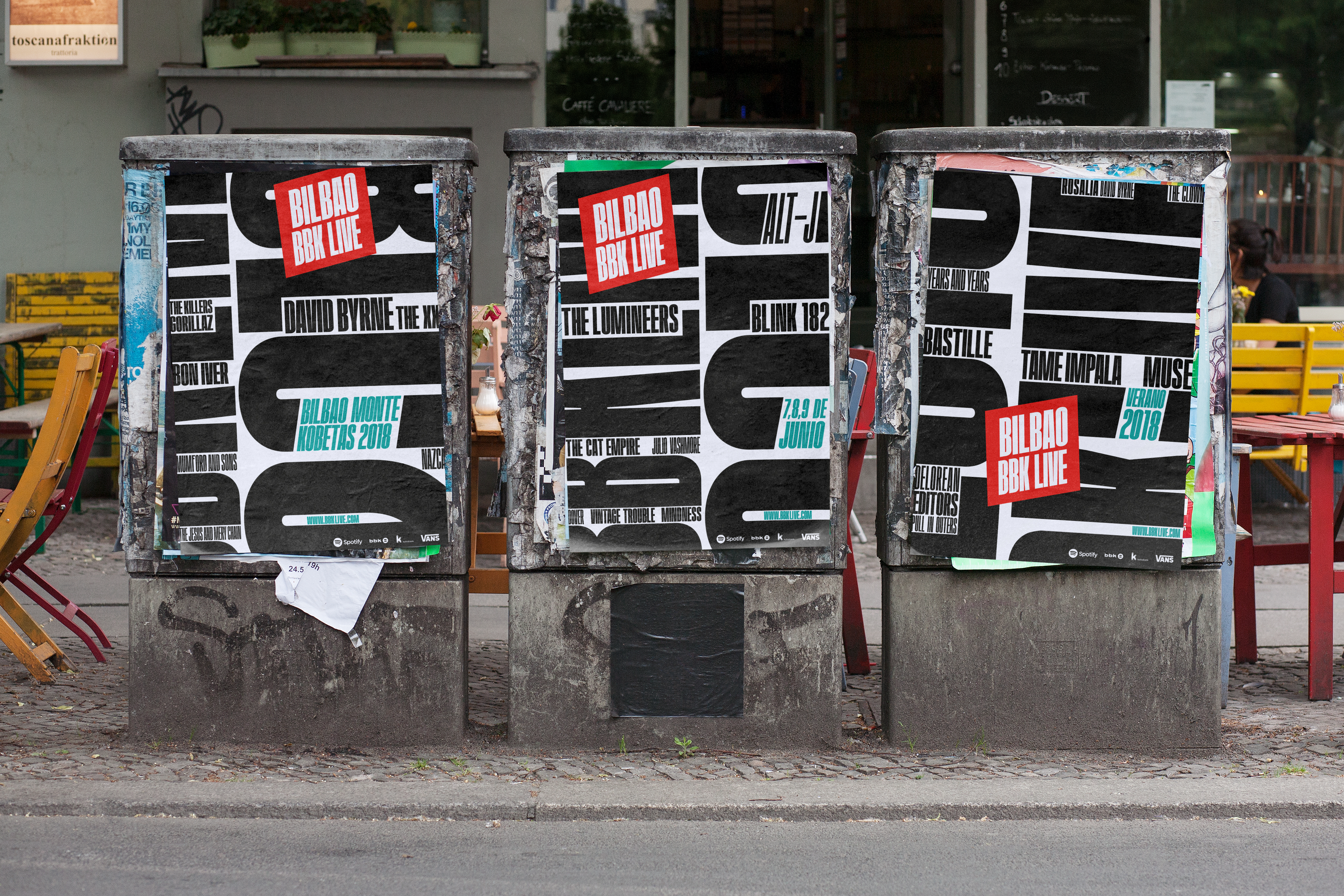 Realización de una serie de posters para el festival Bilbao BBK Live 2018, usando únicamente tipografía para así crear un sistema tipográfico que funcione individualmente y tenga una jerarquía grupal.